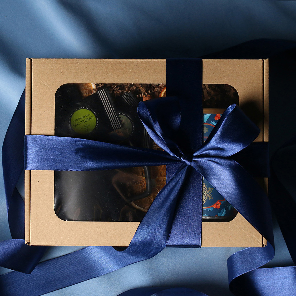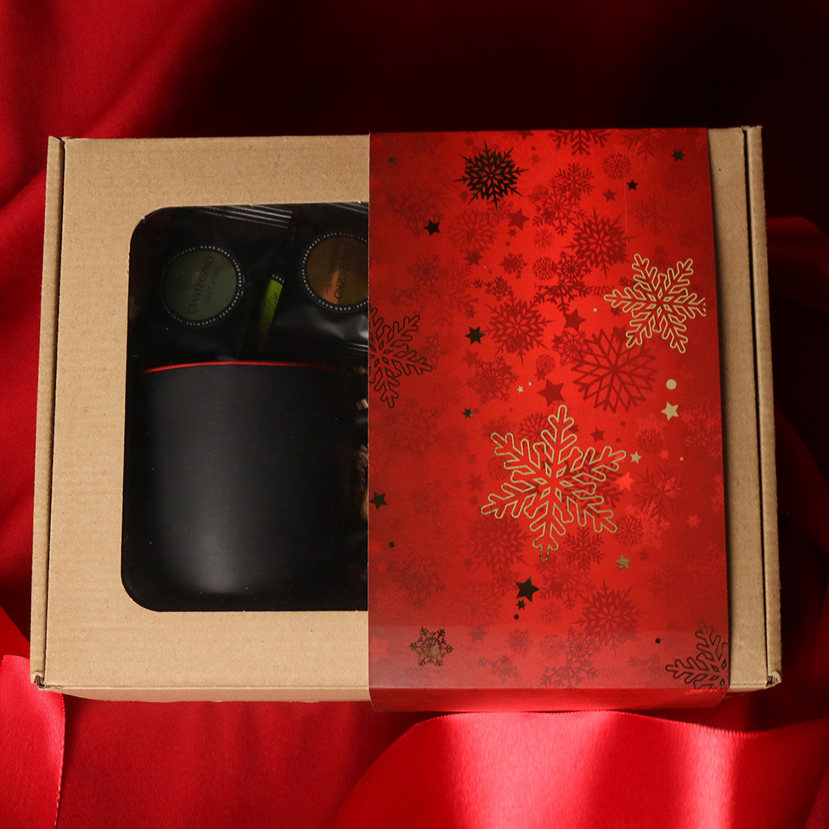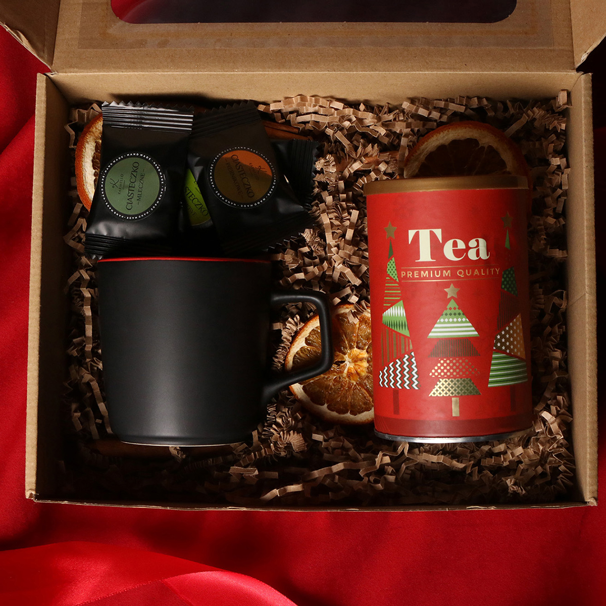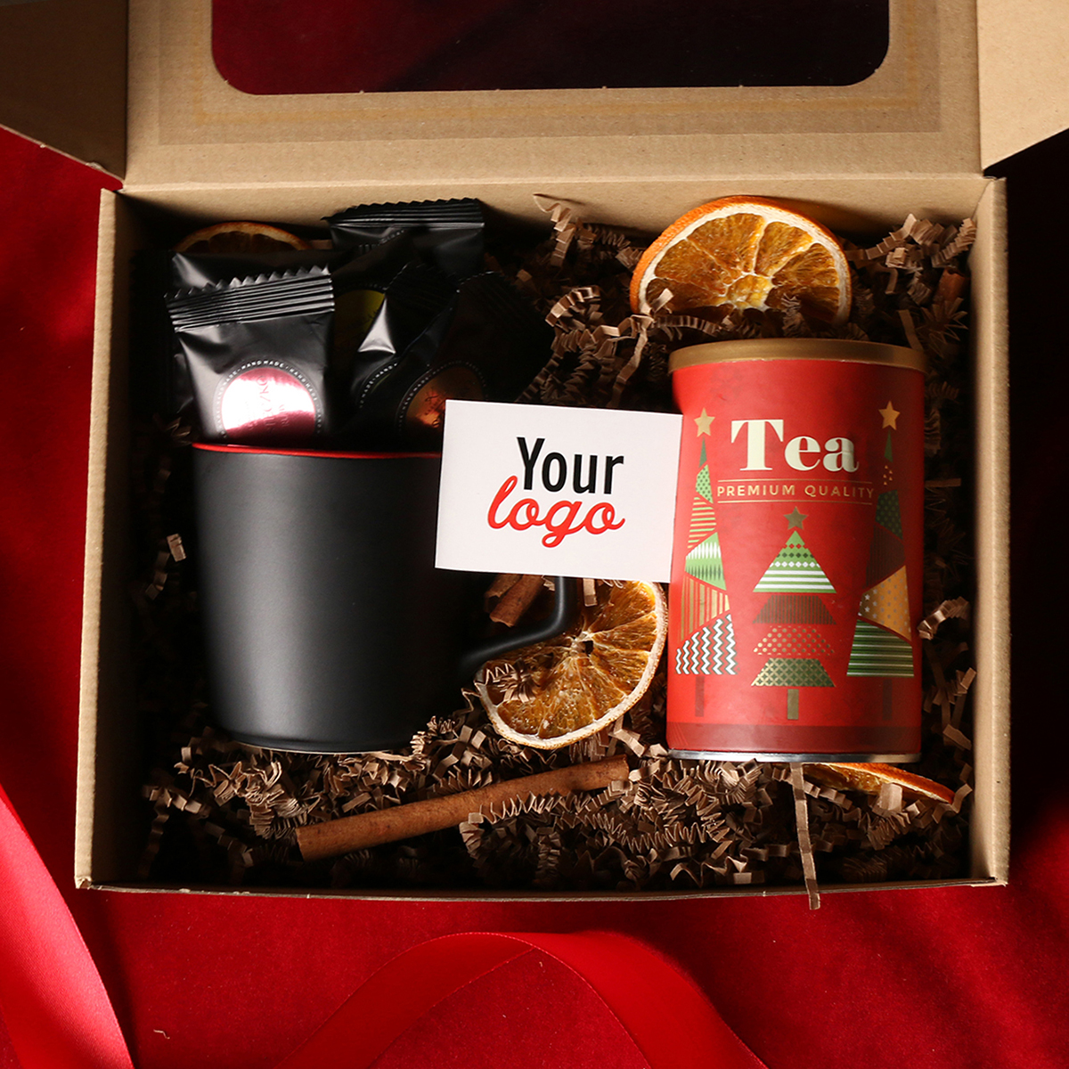Zum Set gehören: Barrel Supreme-Becher schwarz-rot / schwarz-reflexblau / schwarz-schwarz mit Veredelungsmöglichkeit, grüner Sencha-Tee mit Kirschen und Rosenblättern, verpackt in einer Röhre mit winterlichem Motiv, 8 Stück Pralinen – gemischte Geschmacksrichtungen. Alles in einer stilvollen Eco-Kartonverpackung mit Sichtfenster. Zusätzliche Personalisierungsoptionen: Druck auf dem Becher, Anhänger mit Firmenlogo, Schleife oder Banderole mit winterlichem Motiv, veredelt mit Goldprägung.